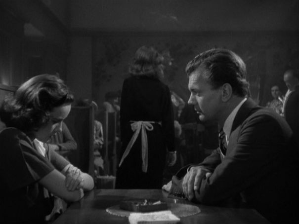 Dès lors, Charlie ne cessera de vouloir s’enfuir du cadre du film pour rejoindre celui qu’elle a quitté. L’inspecteur Jack Graham qui en pince pour elle deviendra dès lors une chance de retourner à la sécurité d’avant. Lui aussi vient d’une famille « normale » et il en est fier. Leurs scènes communes font songer à un film romantique un peu naïf et elles contrastent avec le suspense psychologique qui se joue à côté. On retrouvera quarante ans plus tard dans Blue Velvet de David Lynch ce grand écart entre la bluette et la relation malsaine. La visite de la maison des tarés qu’impose le personnage de Denis Hopper à celui de Kyle Maclachlan se pose d’ailleurs comme une version déviante de la scène du bouge. Malgré la présence du bon détective, une sorte d’assurance pour la suite de sa vie, Charlie n’est plus innocente. Elle ne pourra plus nier que le mal existe, et qu’il peut avoir les traits de la personne qu’elle aime le plus.
