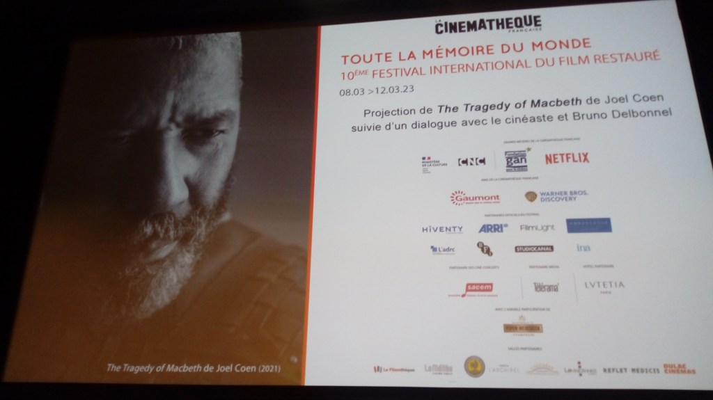 Joel Coen était à la Cinémathèque Française du 8 au 11 mars comme parrain du 10ème festival du film restauré, succédant notamment à Joe Dante ou Nicolas Winding Refn. A cette occasion, avec son chef opérateur Bruno Delbonnel, il a tenu à présenter pour la première fois en salles The Tragedy of MacBeth. Sorti sur Apple TV en janvier 2022, le film avait été projeté un mois dans les salles aux Etats-Unis, mais était passé direct en VOD en France. Le réalisateur a rappelé que The Legend of MacBeth n’avait pas été tourné pour la télévision et qu’Apple TV ne l’avait acquis qu’à la fin de sa production. Le voir sur en salles est comme découvrir le film, tant le grand écran met en valeur des qualités et des détails qui ne sautaient pas vraiment aux yeux sur le petit écran.