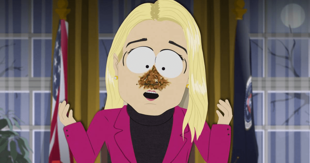 L’épisode d’Halloween de cette saison 28 de South Park (diffusé le 31 octobre) est un condensé de terreur qui rassemble une belle galerie de monstres dans la catégorie « teubés de Washington ». La première de la liste est Pam Bondi, grande nettoyeuse des casseroles de Donald Trump et depuis février dernier, procureure générale des Etats-Unis. La caractéristique de Pam Bondi est d’avoir constamment de la merde sur le nez. En analysant ces résidus, les spécialistes en paranormal convoqués à la Maison Blanche sont persuadés qu’il s’agit de resctoplasmes, et ils énumèrent les restes des derniers repas de Donald Trump, comprenant son propre sperme, ce qui leur vaudra d’être poursuivis pour fake news et emprisonnées. Pam Bondi serait-elle victime de son ardeur à plonger tête baissée pour nettoyer la merde de son chef ? Elle est, quoi qu’il en soit, une rivale de taille pour le vice-président Vance qui craint qu’elle ne lui vole son poste.