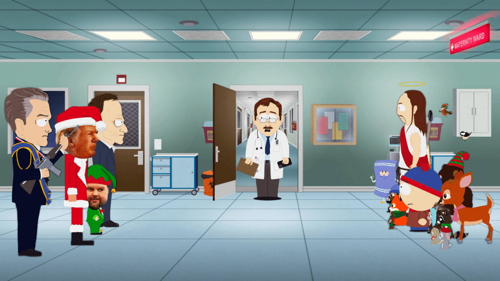 Dans la chambre 6-7 de l’hôpital de South Park, Satan est entouré des Woodland Critters, de Servietsky et de Stan à l’hopital. Une véritable crèche de Noël pour assister à la naissance. L’équipe de choc de Trump pénètre dans l’hôpital pour un grand affrontement qui est interrompu par le plaidoyer de Stan et la rédemption de Jesus. Mais au moment où Trump et son équipe allaient perdre l’avantage, le médecin annonce qu’à un moment où personne ne regardait, l’antechrist…s’est pendu dans le ventre de Satan. Satan n’aura pas son miracle de Noël et Trump fait la fête pour fêter l’évènement à la Maison Blanche. Fox News diffuse les images de la pendaison en précisant qu’il manque quelques minutes avant l’acte. Le parallèle entre l’auto-avortement de l’antechrist et le suicide de Jeffrey Epstein dans sa cellule est flagrant. Le compte à rebours de la naissance de l’antechrist devient rétrospectivement le moment où Donald Trump pourrait enfin être mis face aux conséquences de ses actes. Encore une fois, c’est un pétard mouillé, mais cette affaire aura permis, comme dans la vraie vie, à libérer Jesus de l’emprise du Président (les partisans chrétiens de Trump le lâchent peu à peu). Et c’est peut-être ça, plus que la naissance de l’antechrist, qui est le véritable enjeu de ces saisons 27 et 28.